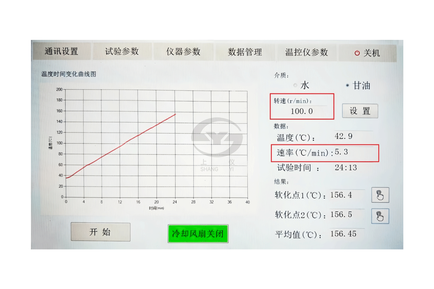 升溫速率 介質(zhì)為水時(shí),試驗(yàn)開始三分鐘后自動(dòng)調(diào)整至(5±0.5)℃/min;介質(zhì)為油時(shí),升溫到60℃后,自動(dòng)調(diào)整至(5±0.5)℃/min