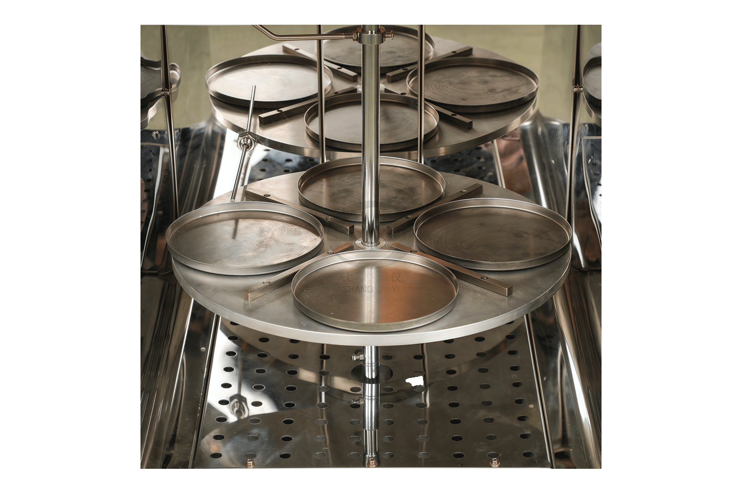 5、工作室中央裝有可以放置四只瀝青盛樣皿的轉(zhuǎn)盤,它由電機(jī)帶動(dòng),以每分鐘5.5轉(zhuǎn)的速度轉(zhuǎn)動(dòng)。